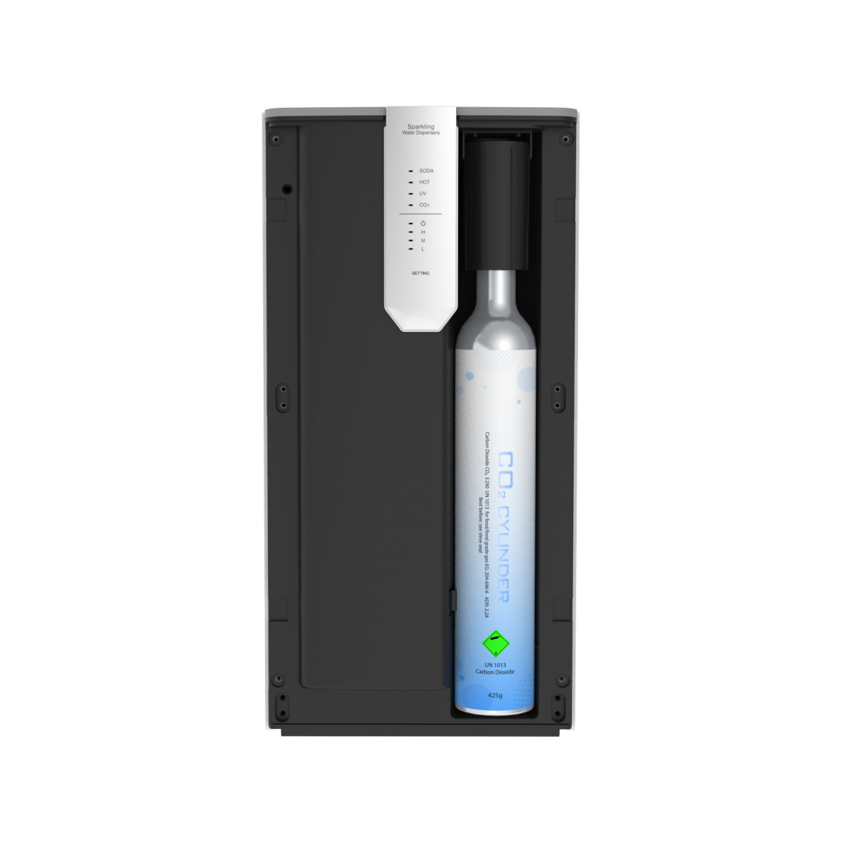 Both filter and CO2 cylinder are placed inside of the water dispenser, save the external space.