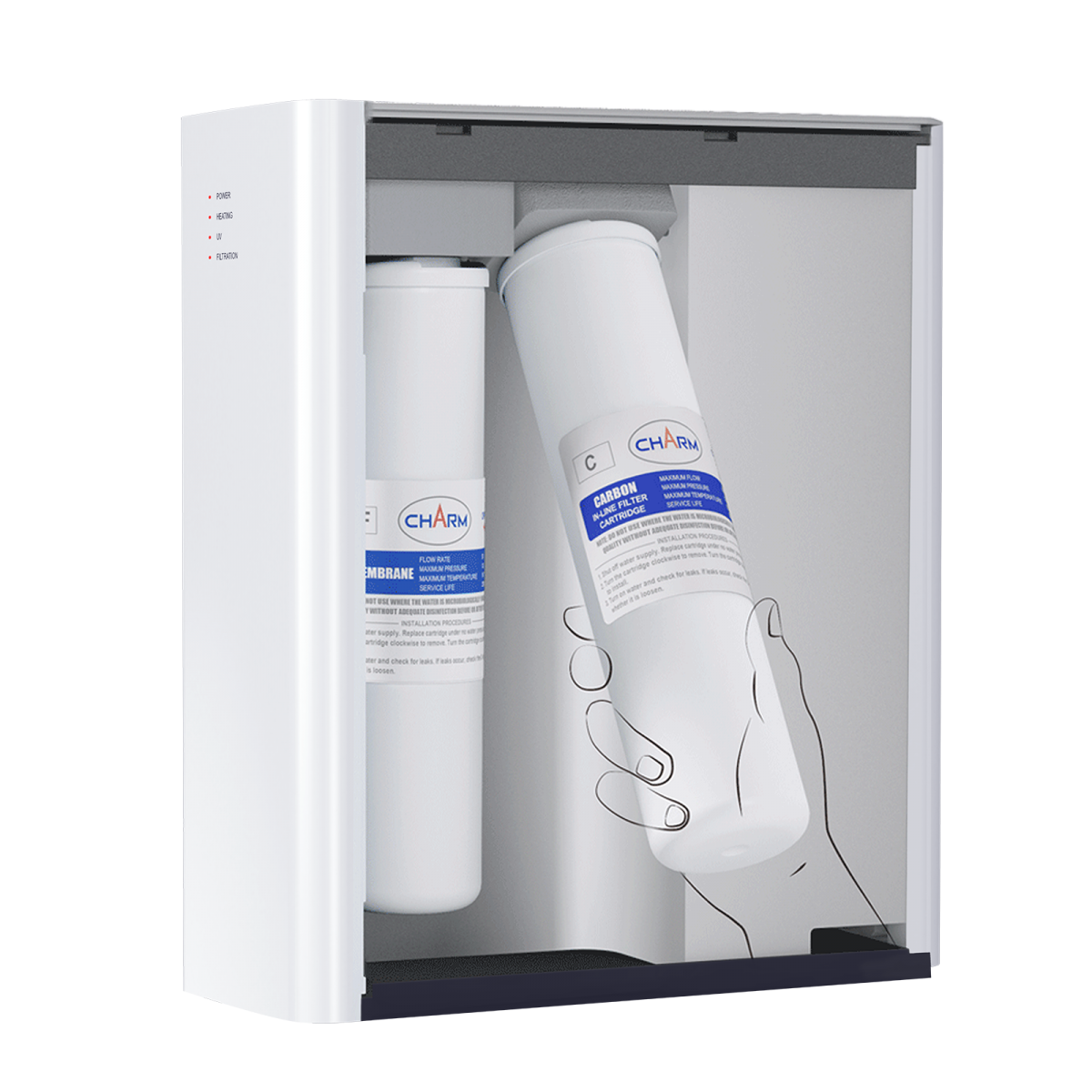 UV紫外線瞬間啟動殺菌系統: 裝置於極接近出水口處的UV燈將於取水時瞬間開啟UV紫外線燈光照射並殺菌,可有效的消滅水中99.9%以上的細菌,因無長時間的UV紫外線燈光照射,不會使冰水與氣泡水的溫度變高而直接影響飲用口感。