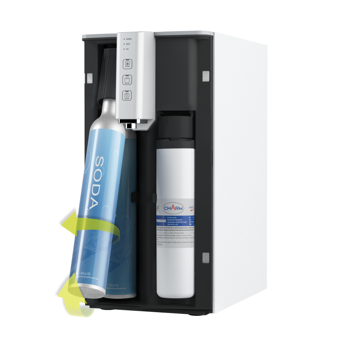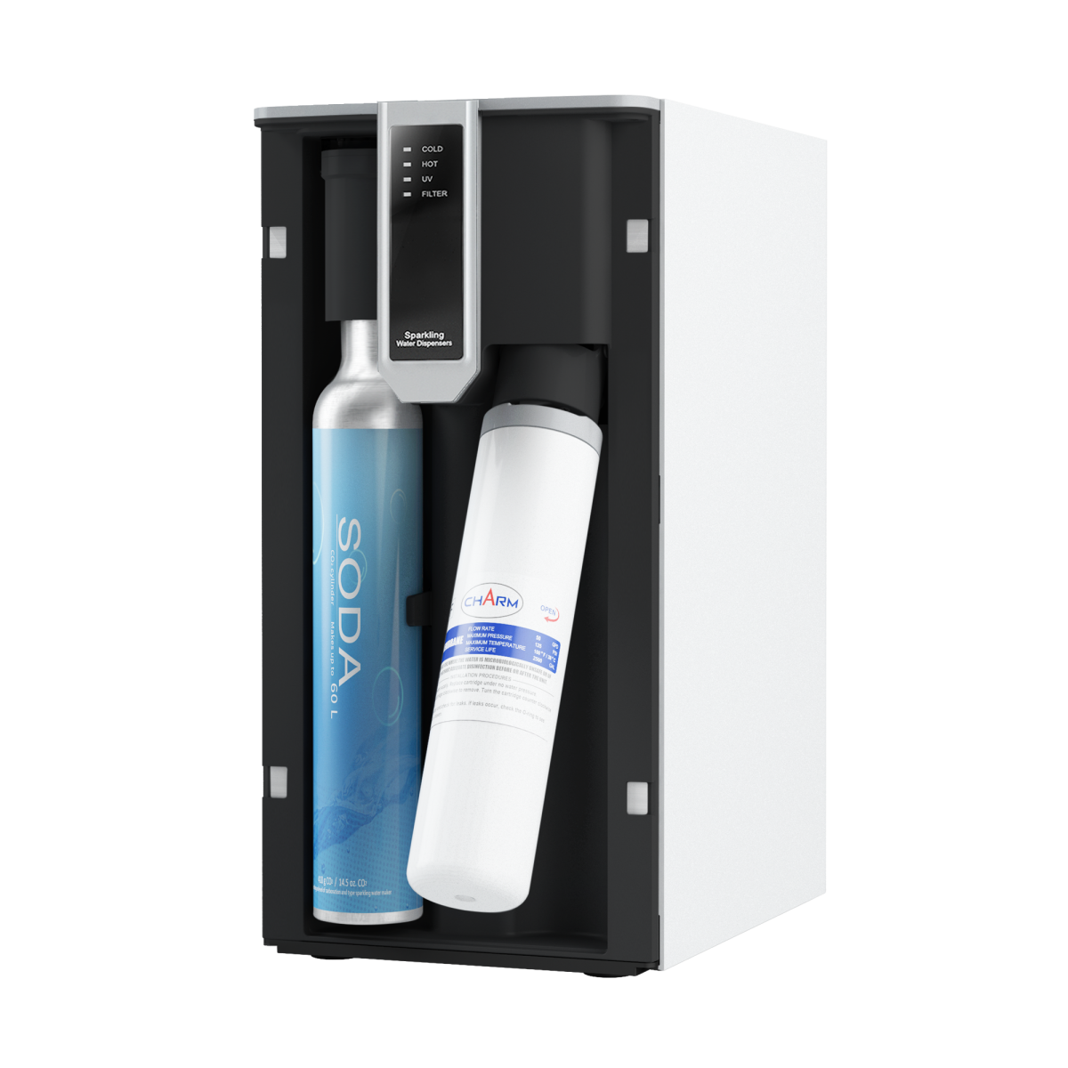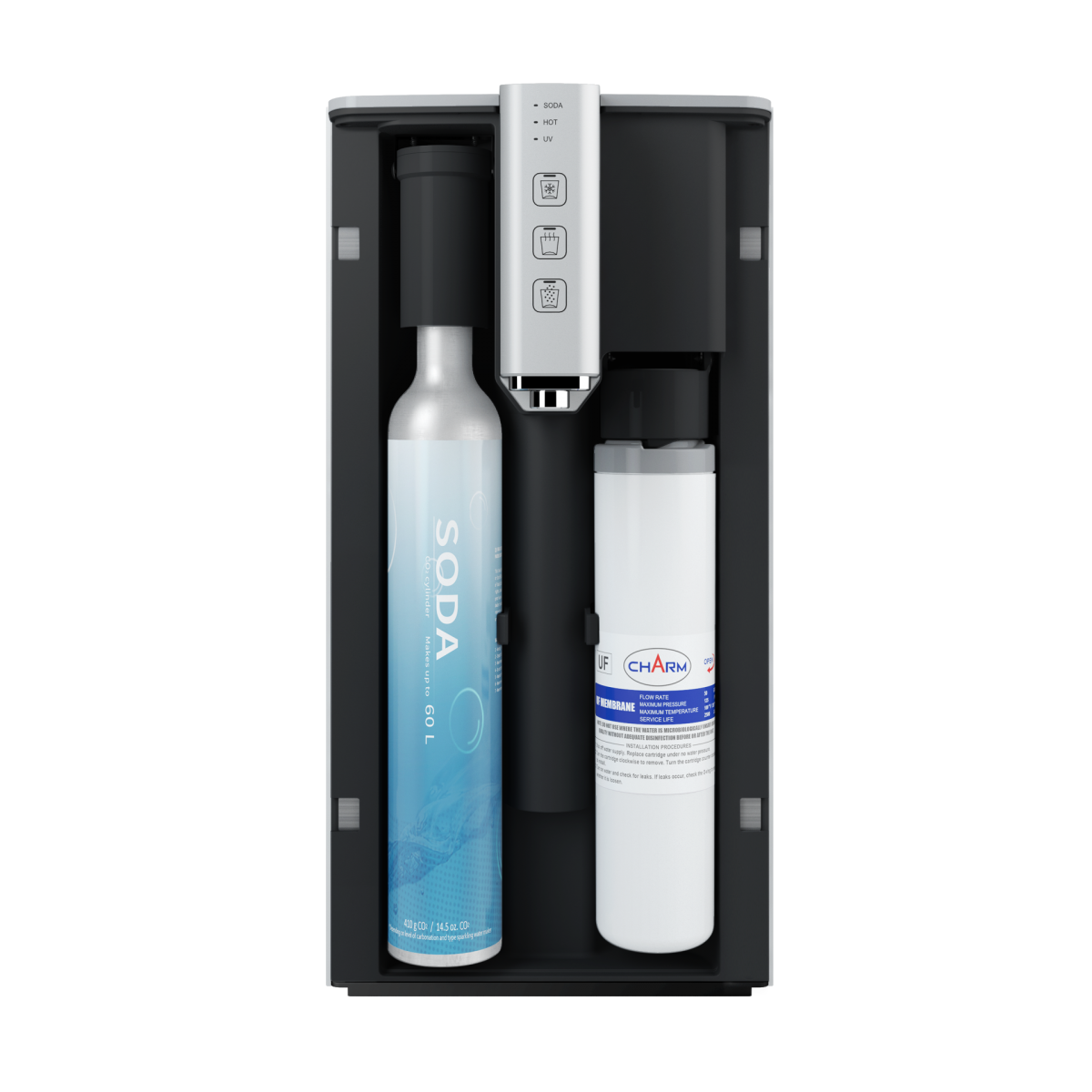 所有的可拆裝耗材皆放置於機身內,節省下了外部所需的空間,搭配迷你尺寸的設計,讓小空間也可以放置冰水/熱水/氣泡水三合一的飲水機。