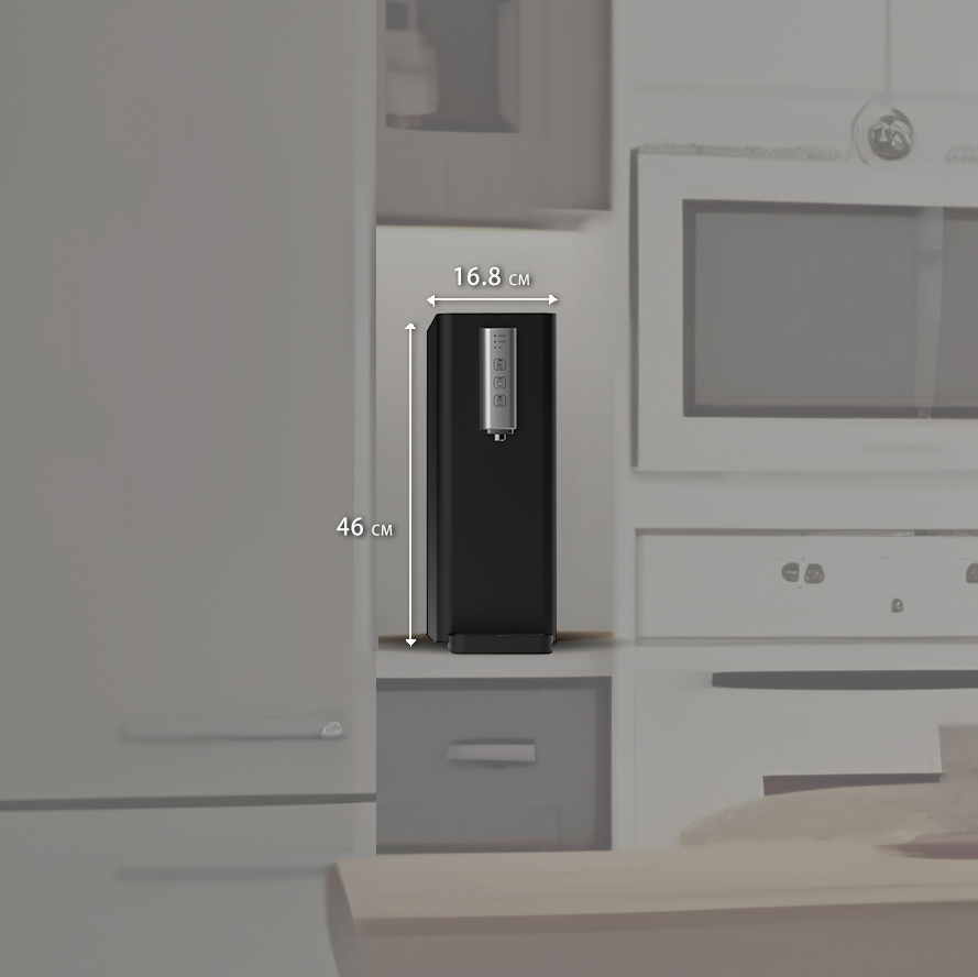 飲水機纖薄的尺寸(16.8 寬 x 35.3 深 x 46 高公分)特性,可以靈活地放置在任何狹小的地方。